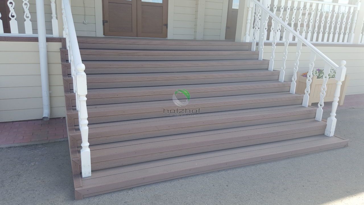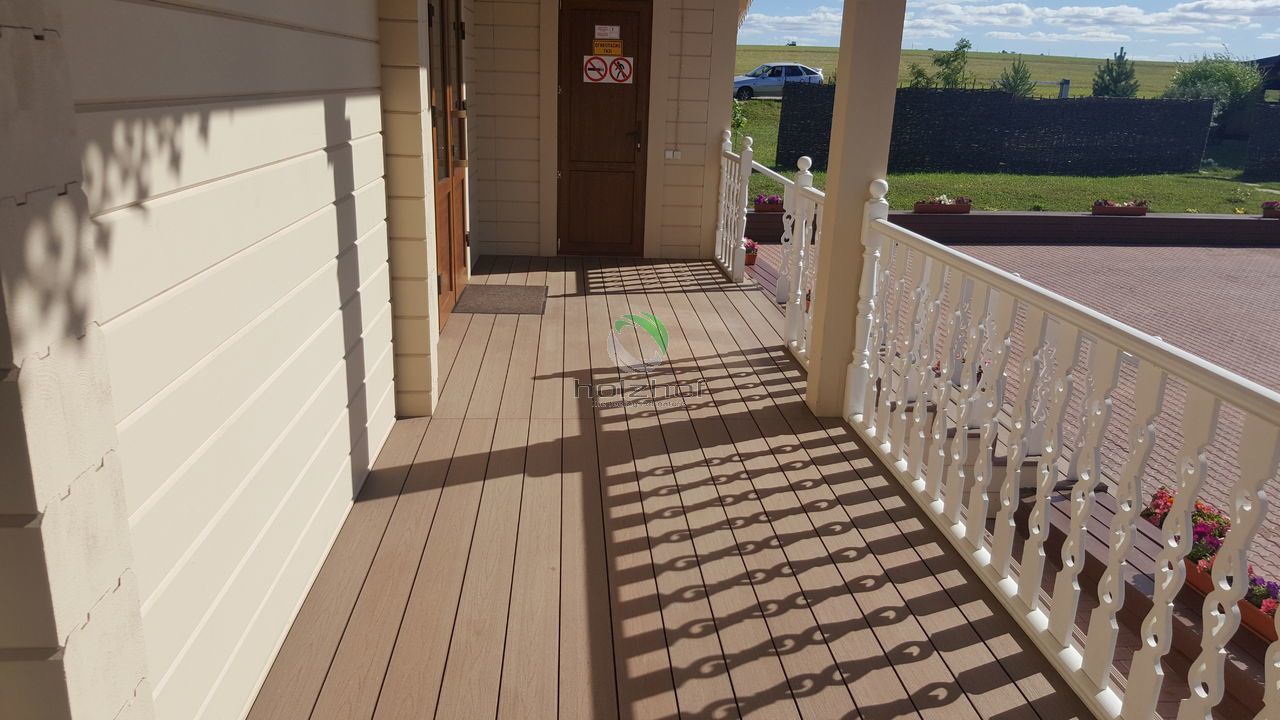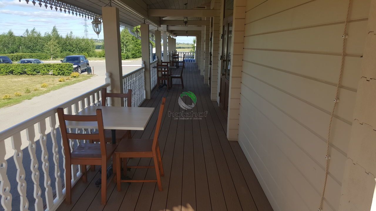 На агроусадьбе смонтирована террасная доска Holzhof с тиснением, которая отлично вписалась в общий интерьер, террасная доска будет долго и надежно служить и радовать посетителей, своим внешним видом и превосходным качеством.