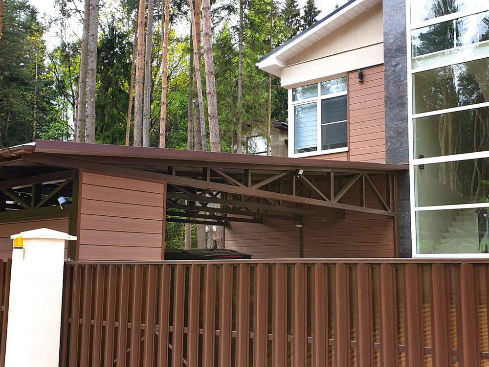 Вот примерно такая задача стояла перед нашими специалистами, решить вопрос обустройства квадратных метров, с максимально продуманным решением. Но и нельзя было забывать о железных конях, которые доставляют гостей. Необходимо было соорудить и обустроить максимально удобно навес, который устраивал всех.