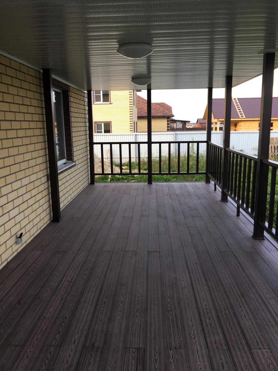 Ограждения и перила лесенки также марки Holzhof. Особенностью монтажа ограждений из ДПК Holzhof стало то, что трехметровый профиль был надет на металлические столбы-опоры прямо до потолка крыши, что придало всем ограждениям единый стиль цвета венге и органично вписалось в архитектуру дома.